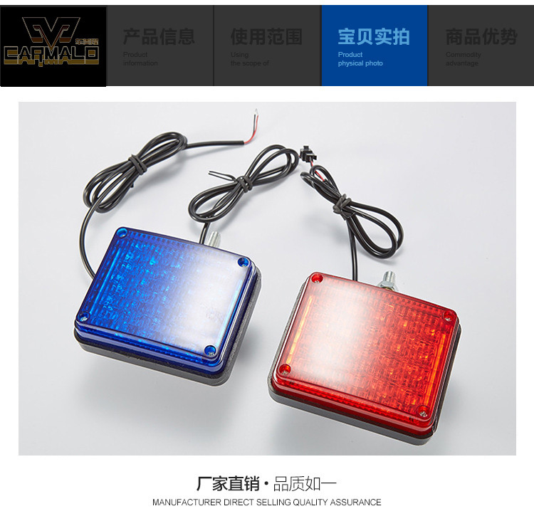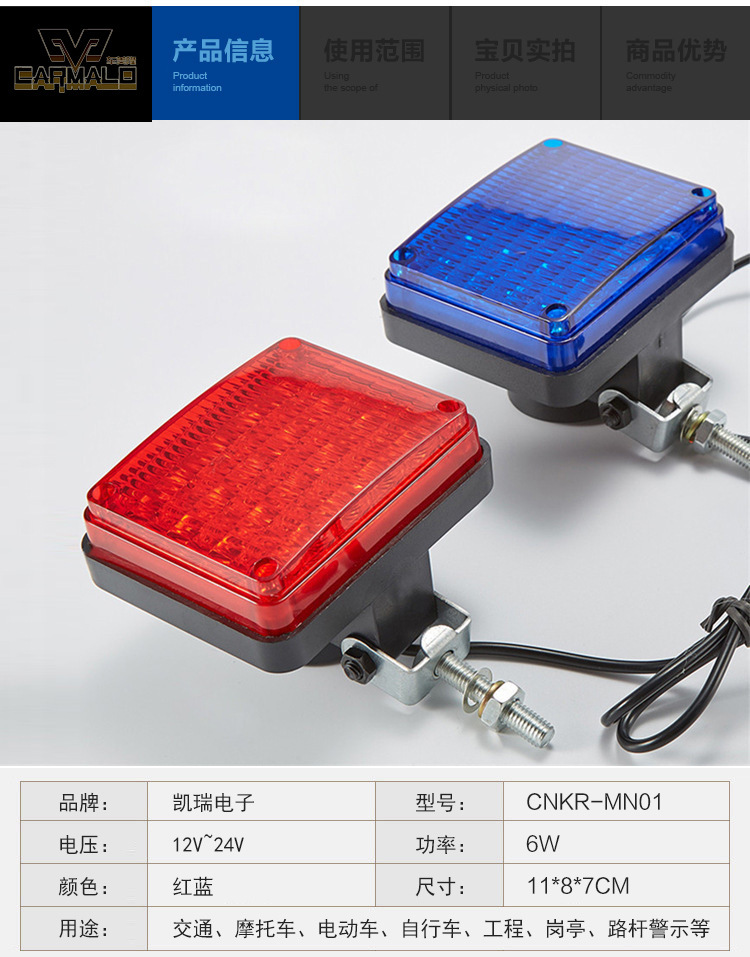 nfig="{"showOn":["mod-detail-description"],"title":"產(chǎn)品屬性"}" data-feature-json="[{"fid":2176,"values":["CARMALO"],"name":"品牌","id":2176,"value":"CARMALO"},{"fid":287,"values":["ABS"],"name":"材質(zhì)","id":287,"value":"ABS"},{"fid":1398,"values":["CML-G001"],"name":"貨號(hào)","id":1398,"value":"CML-G001"},{"fid":346,"values":["廣州"],"name":"產(chǎn)地","id":346,"value":"廣州"},{"fid":100000729,"values":["是"],"name":"加工定制","id":100000729,"value":"是"},{"fid":1134,"unit":"W","values":["6"],"name":"功率","id":1134,"value":"6"},{"fid":716,"unit":"V","values":["12-24"],"name":"電壓","id":716,"value":"12-24"},{"fid":3216,"values":["紅/藍(lán)"],"name":"顏色","id":3216,"value":"紅/藍(lán)"},{"fid":3151,"values":["CML-G001"],"name":"型號(hào)","id":3151,"value":"CML-G001"},{"fid":2553,"values":["通用"],"name":"適用車型","id":2553,"value":"通用"},{"fid":101087480,"values":["通用"],"name":"適配車型","id":101087480,"value":"通用"},{"fid":136048003,"values":["適用"],"name":"配套關(guān)系","id":136048003,"value":"適用"},{"fid":182318189,"values":["wish","亞馬遜","速賣通","LAZADA","ebay"],"name":"主要下游平臺(tái)","id":182318189,"value":"wish,亞馬遜,速賣通,LAZADA,ebay"},{"fid":193290002,"values":["東南亞","東北亞","歐洲","中東","非洲","北美","南美"],"name":"主要銷售地區(qū)","id":193290002,"value":"東南亞,東北亞,歐洲,中東,非洲,北美,南美"},{"fid":193290003,"values":["是"],"name":"有可授權(quán)的自有品牌","id":193290003,"value":"是"},{"fid":182282223,"values":["是"],"name":"是否跨境出口專供貨源","id":182282223,"value":"是"}]" ready-to-show="true" style="outline: none; margin-bottom: 22px; position: relative; color: rgb(51, 51, 51); border-bottom: 1px solid rgb(229, 229, 229); border-image: initial; border-left: none; border-right: none; border-top: 0px; clear: both; zoom: 1; width: auto !important;">