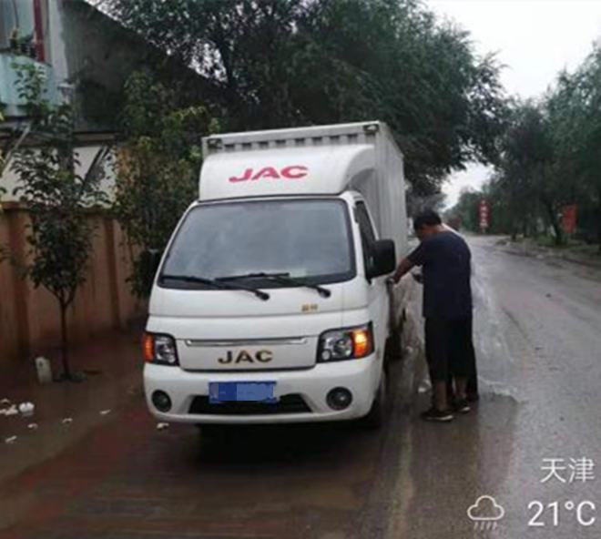 江淮輕卡維修人員身披塑料袋冒雨搶修車輛