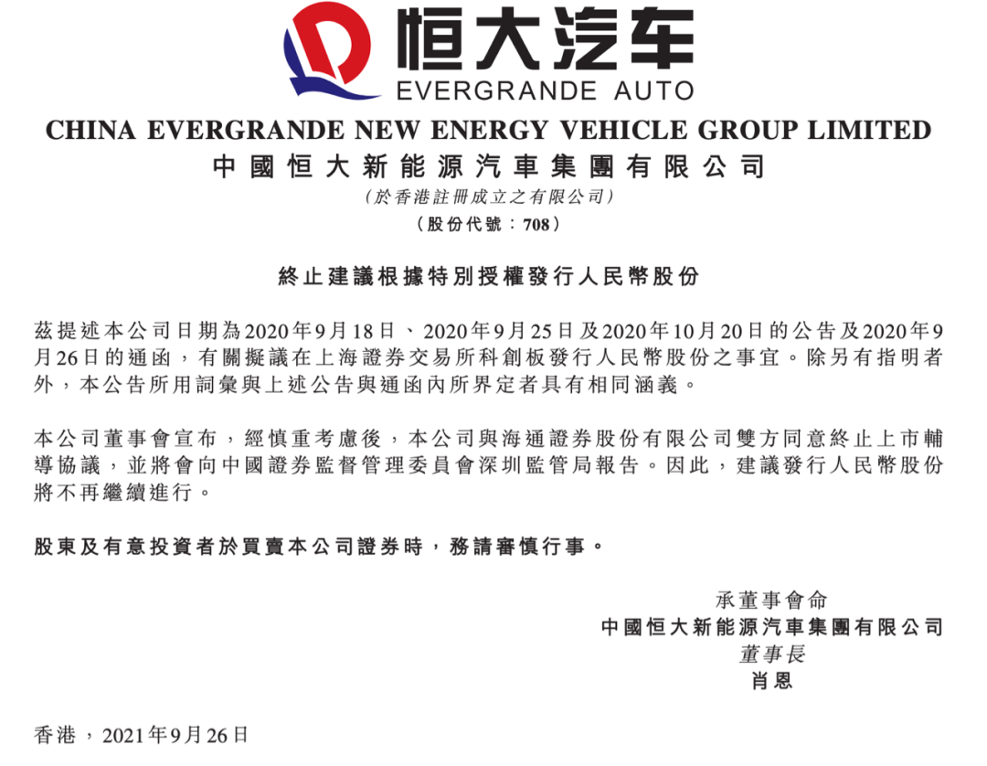 9月26日,恒大汽車發(fā)布公告表示,公司與海通證券股份有限公司雙方同意終止上市輔導(dǎo)協(xié)議。這意味著,恒大汽車主動(dòng)放棄登陸A股的機(jī)會(huì)。