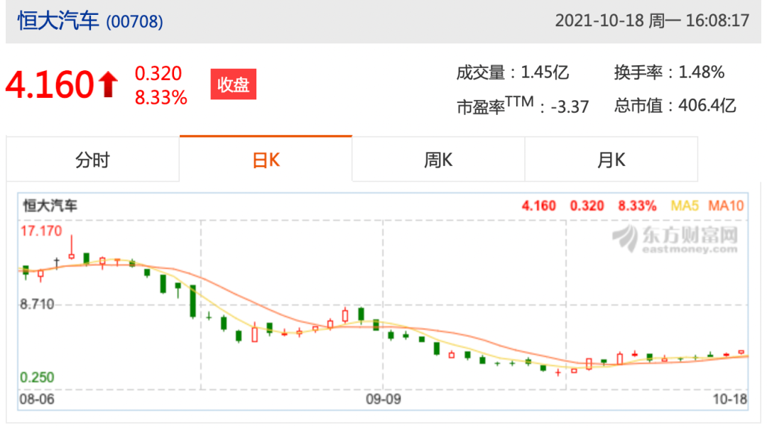 再將時(shí)間線提前,10月4日,受負(fù)面消息影響,恒大集團(tuán)的股票在當(dāng)日上午九時(shí)暫停買賣。據(jù)老虎證券數(shù)據(jù)顯示,當(dāng)日恒大汽車股價(jià)最低跌到2.77港元。截至今日發(fā)稿,恒大汽車股價(jià)漲到4.16港元,市值達(dá)到406.4億港元。