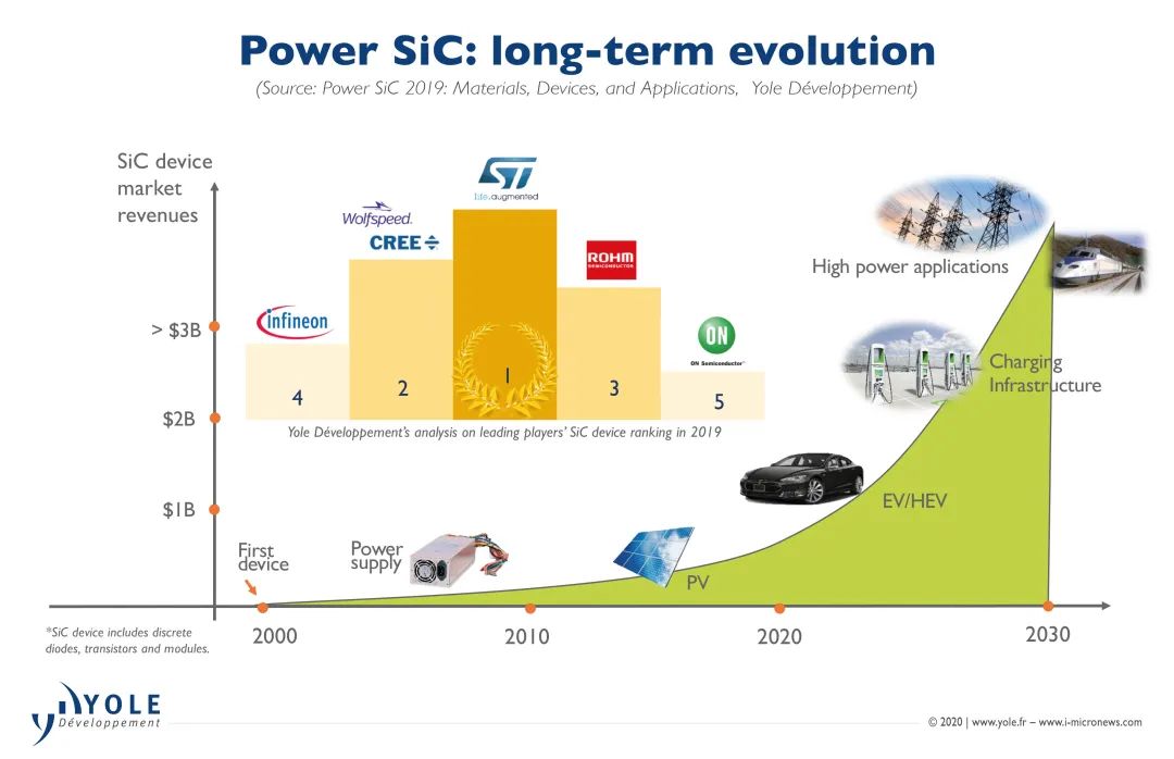 從發(fā)展歷史來說,全球首款碳化硅功率半導(dǎo)體SiC MOSFET的推出,是在2011年。而在這之前,美國科銳(Cree)公司經(jīng)過了將近二十年的研發(fā),可謂“難產(chǎn)”。十年之后,SiC才終于迎來“爆發(fā)元年”。