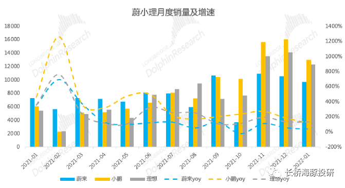 橫向?qū)Ρ刃※i和蔚來(lái),小鵬汽車目前實(shí)現(xiàn)了全面領(lǐng)先,理想在三個(gè)新勢(shì)力中排名第二,蔚來(lái)乏力。21年四季度小鵬/理想/蔚來(lái)的交付量分別為4.2萬(wàn)輛/3.5萬(wàn)輛/2.5萬(wàn)輛,2021年全年,小鵬/理想/蔚來(lái)的交付量分別為9.82萬(wàn)輛/9.05萬(wàn)輛/9.14萬(wàn)輛。