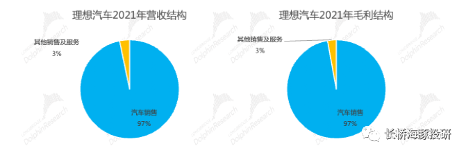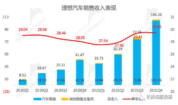 2.2 量增價(jià)穩(wěn),收入符合預(yù)期。四季度公司實(shí)現(xiàn)銷售收入106億元,超公司指引和彭博一致預(yù)期,符合長(zhǎng)橋海豚君預(yù)期(公司指引88-94億元,彭博一致預(yù)期的102億元)。其中汽車銷售收入104億元,同比增156%。2021年全年,理想汽車實(shí)現(xiàn)銷售收入270億元。