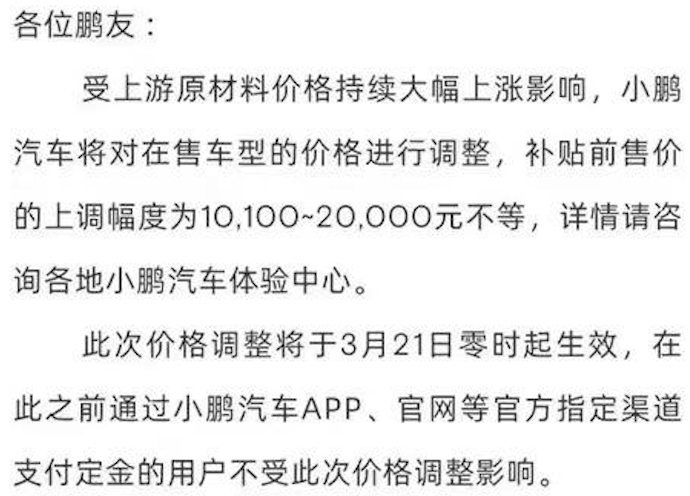3月21日,小鵬汽車宣布全面漲價,幅度1-2萬元不等,力度不小。小鵬汽車給的原因是受上游原材料價格持續(xù)大幅上漲影響。