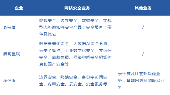 奇安信和啟明星辰的業(yè)務(wù)則主要集中在網(wǎng)絡(luò)安全。奇安信的網(wǎng)絡(luò)安全業(yè)務(wù)主要包括網(wǎng)絡(luò)安全產(chǎn)品、網(wǎng)絡(luò)安全服務(wù)、硬件及其他,其中,安全服務(wù)是根據(jù)客戶的實際需求,為客戶提供的技術(shù)、咨詢及安全保障等服務(wù),硬件及其他業(yè)務(wù)是在為客戶提供體系化網(wǎng)絡(luò)安全解決方案的過程中涉及到的政企客戶信息化配套改造類項目;啟明星辰的網(wǎng)絡(luò)安全產(chǎn)品則主要分為安全產(chǎn)品、安全運營與服務(wù)。