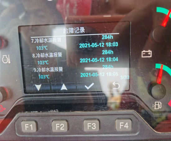 客戶來(lái)電反饋,車輛在工作時(shí)儀表多次出現(xiàn)發(fā)動(dòng)機(jī)冷卻水溫報(bào)警故障碼,水溫高達(dá)103℃,設(shè)備無(wú)法正常使用。