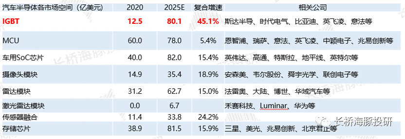 1)市場空間:2025年IGBT/車用SoC芯片/存儲芯片/MCU>雷達模塊>攝像頭模塊>激光雷達;