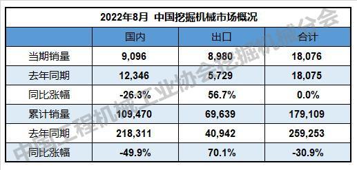 2022年8月,共計銷售各類挖掘機械產(chǎn)品18,076臺,與去年同期持平。其中,國內(nèi)市場銷量9,096臺,同比下降26.3%;出口銷量8,980臺,同比增長56.7%。