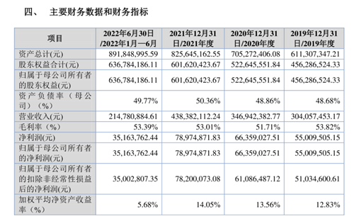 招股書顯示,2019-2021年,藍(lán)色星際分別實現(xiàn)營業(yè)收入30,405.75萬元,34,694.24萬元,43,838.21萬元,復(fù)合增長率為20.07%。凈利潤分別為5,500.95萬元,6,635.90萬元,7,897.49萬元。綜合毛利率分別53.82%、51.71%、53.01%。