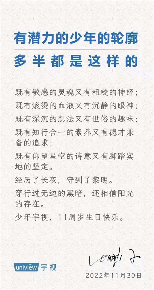 “穿行過無邊的黑暗,還相信光的存在。”在宇視十一周歲生日當天,宇視科技總裁張鵬國親筆書寫了其對宇視的展望寄語,十年磨一劍,宇視仍少年,阿宇未來可期。