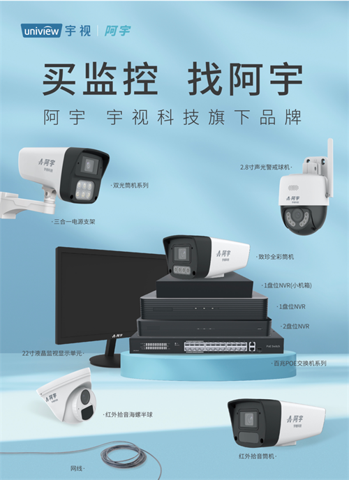 主要集中在IPC、NVR、支架、交換機和網(wǎng)線五大類,例如阿宇智能云臺攝像機、阿宇22/43寸監(jiān)視器、阿宇致珍全彩筒機、阿宇守護者系列2.8寸小球機、阿宇300萬雙光警戒筒機、阿宇1盤位系列NVR、阿宇百兆低功率交換機等。