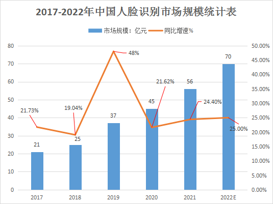 數(shù)據(jù)顯示,2021年中國人臉識別市場規(guī)模為56億元,同比增長24.4%。若按照年均復合增長率作為參考值,預計2022年中國人臉識別市場規(guī)模將達到70億元,2024年將突破100億元。