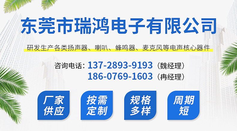 東莞市瑞鴻電子有限公司開發(fā)、生產(chǎn)、銷售揚(yáng)聲器,喇叭,音響喇叭,方型喇叭,蜂鳴器,麥克風(fēng),電腦喇叭,連接器等電聲產(chǎn)品