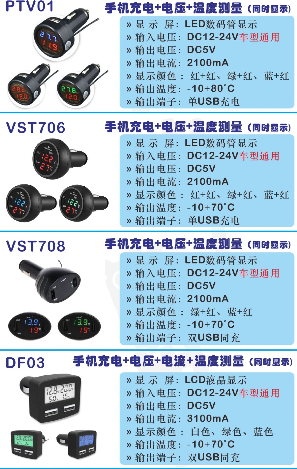 型號(hào)PV紅顯(車充USB+電壓表),PV藍(lán)顯(車充USB+電壓表),PV綠顯(車充USB+電壓表),TV紅紅顯(電壓+溫度表),TV綠紅顯(電壓+溫度表),TV藍(lán)紅顯(電壓+溫度表),PTV紅(單USB+電壓+溫度),PTV綠(單USB+電壓+溫度),PTV藍(lán)(單USB+電壓+溫度),EC2紅(雙USB+電壓+電流)黑殼,EC2藍(lán)(雙USB+電壓+電流)黑殼,706藍(lán)紅(單USB+電壓+溫度),706綠紅(單USB+電壓+溫度),708藍(lán)紅(雙USB+電壓+溫度),708綠紅(雙USB+電壓+溫度),5合1_LCD白光,5合1_LCD藍(lán)光,5合1_LCD綠光,706紅紅(單USB+電壓+溫度)