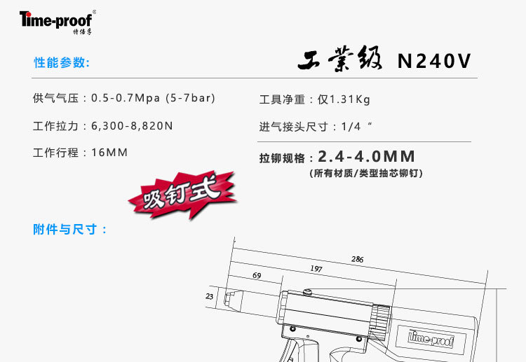 特倍孚(Time-proof)工業(yè)級吸釘式氣動鉚釘槍不銹鋼抽芯拉鉚槍