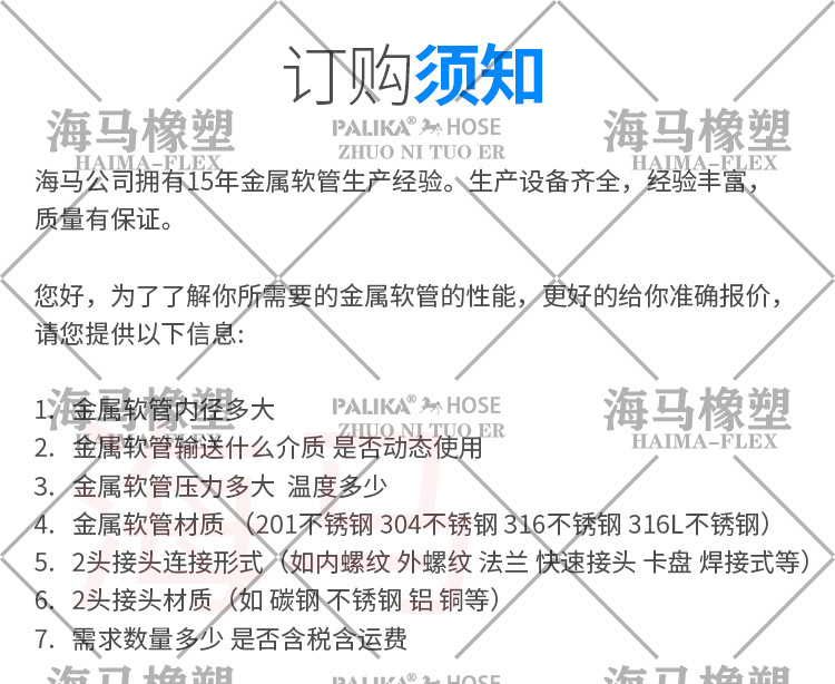 8、 不能用含氯的清潔劑活鋼絲刷清除金屬軟管內(nèi)的污物。
